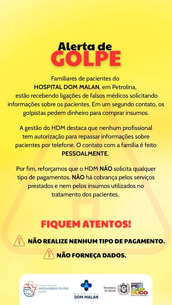 O Hospital Dom Malan (HDM) Ismep em Petrolina, pertencente à rede estadual de saúde, faz um alerta à população dos 53 municípios da macrorregião interestadual PEBA (hospitais de Pernambuco e Bahia), atendida pela unidade. O golpe dos falsos médicos que solicitam informações de pacientes através de ligações telefônicas. Num segundo contato, esses golpistas pedem dinheiro, alegando ser para compra de insumos hospitalares.